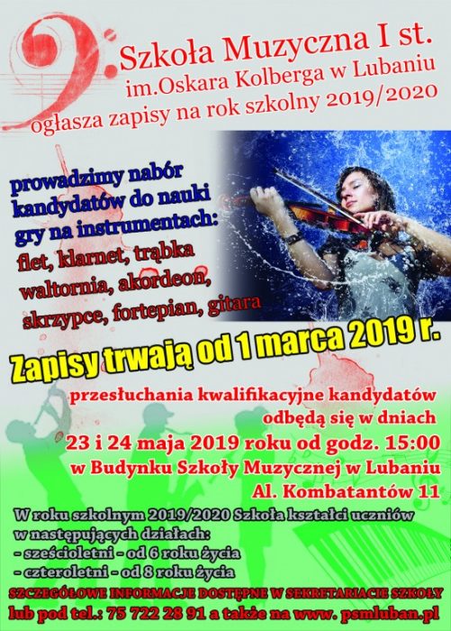 Szkoła Muzyczna I stopnia im. Oskara Kolberga w Lubaniu ogłasza nabór uczniów na rok szkolny 2019/20 do klas: fortepianu, skrzypiec, gitary, fletu, klarnetu, trąbki, waltorni oraz akordeonu. Zapisy od 1 marca br. Zapraszamy!