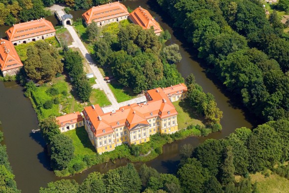 Radomierzyce to mała, położona nad Nysą Łużycką wioska, gdzie znajduje się ten wielki pałac. Został zbudowany w 1708 r. na wyspie otoczonej podwójną fosą. To jeden z najwspanialszych zabytków w tej części Europy. Przez niemal trzy stulecia pałac w Radomierzycach gościł w swoich salonach m.in. króla Polski Augusta II Mocnego, króla Prus Fryderyka II Wielkiego, cesarza Niemiec Wilhelma I, czy choćby prezydenta Rzeszy von Hindenburga. Gośćmi byli tu też sławni artyści, poeci i generałowie. Sławni goście nie pojawiali się tu przypadkowo – fundatorem pałacu był Joachim Sigismund von Ziegler, podkomorzy Augusta II Mocnego. Zapisał posiadłość fundacji dobroczynnej. Pałac miał być siedzibą przytułku dla dwunastu szlachcianek i jednej ochmistrzyni (też arystokratki), które nie z własnej winy popadły w biedę. Żeby zamieszkać w Radomierzycach, musiały być pannami wyznania ewangelickiego i udokumentować szlacheckie pochodzenie od co najmniej czterech pokoleń. Od listopada 1728 r. w pałacu w Radomierzycach działał prowadzony przez ewangelicką fundację zakład dla arystokratek.