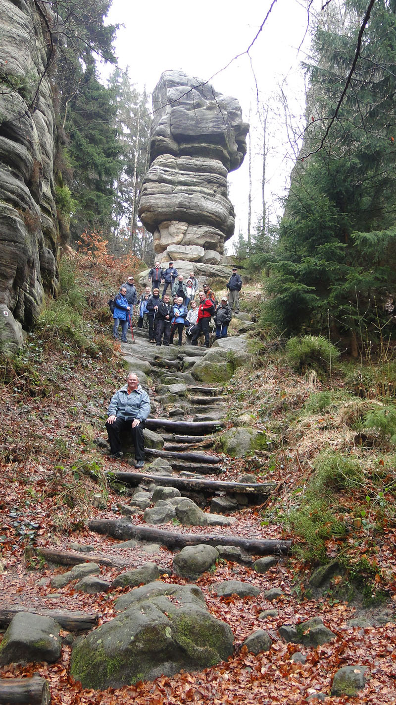 Kiedy wyszliśmy z wąwozu, zrobiło się trochę cieplej. Nikt jednak nie spodziewał się, że za chwilę będzie nam naprawdę gorąco. A to za sprawą wspinaczki po bardzo stromych schodach i drabinach prowadzących na górujące nad doliną skalne gniazdo, na którym znajdował się dawniej zamek Strzemię. Obecnie poza otworami na belki widocznymi w skałach nie ma już żadnych innych śladów po tej warowni. Wiktor zachęcając nas do wejścia na górę uprzedzał, że droga jest bardzo wymagająca. Nie powiedział jednak, że da nam niezły wycisk. Już po pokonaniu 100 stopni czuliśmy, jak łapią nas skurcze w nogach. Dalej było jeszcze gorzej. Stromizna drabin powodowała nasze szybkie zmęczenie. W sumie pokonaliśmy ponad 320 stopni. Na osłodę poprawiła się widoczność i mogliśmy pooglądać najbliższą okolicę. Zadowoleni i szczęśliwi, chociaż bardzo zmęczeni ostrożnie zeszliśmy na dół i dotarliśmy do stacji kolejowej Teplice nad Metují Skály.