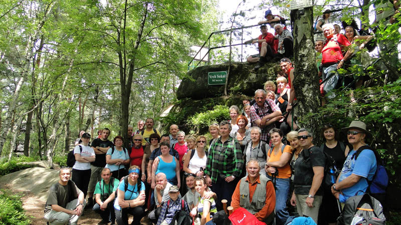 Podczas krótkiego odpoczynku (trzeba dać szansę ostatnim w grupie) z lasu wyskakuje całe stadko brązowych szczeniaczków. Staramy się je policzyć co, ze względu na ich ruchliwość, nie jest wcale takie łatwe. W końcu udało się. Jest ich sześć sztuk. Zanim zdążyliśmy zaprzyjaźnić się z nimi dochodzą do nas ich właściciele i te ruszają za nimi. Pewnie wiedzą kto ich karmi. Jesteśmy w miejscu zwanym Pánovo pole. Do szczytu pozostał tylko kilometr. Po drodze czeka nas jeszcze jedno ciekawe miejsce. Widzimy tam bazaltowe skałki o fantazyjnych kształtach. Na jednej z nich umieszczono medalion upamiętniający dr. Martina Tyrša, założyciela Towarzystwa Gimnastycznego „Sokol”. Po chwili jesteśmy na szczycie Sokol. Znajduje się tu punkt widokowy, do którego prowadzą wykute w skale schodki. Ponownie widzimy Suche Skały. Są one jednak zupełnie inne niż widziane z dołu. Robimy sobie pamiątkowe zdjęcie pod tablicą, na której pisze Vrch Sokol 562 m. n. m. My piszemy nad poziomem morza a Czesi nad morzem.
