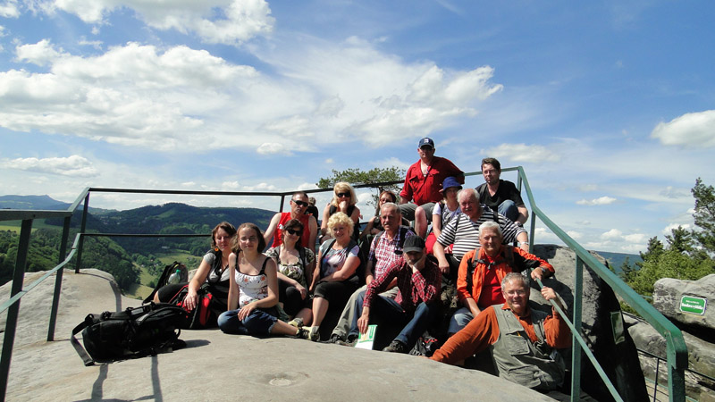 Przyzwyczajeni do otaczającego nas piękna zostajemy zaskoczeni gdy przedzierając się skalnymi szczelinami docieramy do miejsc, w których zupełnie nie wiemy jak dalej iść. Z każdej strony, poza tą z której przyszliśmy widzimy strome ściany skalne i żadnej dalszej drogi. Dopiero gdy podchodzimy pod samą skałę dostrzegamy jakieś tunelik, którym przeciskamy się (często na czworaka) dalej. Szlak nie jest tutaj najlepiej oznakowany (może zrobiono to specjalnie?), dlatego trzeba dobrze uważać. Do tego coraz większa stromizna, jakieś pojawiające się i znikające schodki, jakieś jaskinie, ślepe ścieżki prowadzące do punktów widokowych. Grupa powoli dzieli się na małe zespoły. Każdy podażą inną ścieżką. Wkrótce jednak wszystko wraca do normy. Dotarliśmy na szczyt gdzie umieszczono tabliczkę z następującym tekstem: „Skály na Chlévišti – Hořákova vyhlídka”.