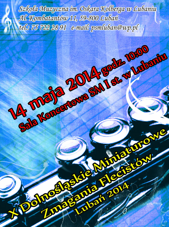 W dniu 14 maja 2014 r. w szkole muzycznej w Lubaniu odbędą się Jubileuszowe X Dolnośląskie Miniaturowe Zmagania Flecistów. Weźmie w nich udział 34 utalentowanych młodych flecistów ze szkół muzycznych Dolnego Śląska z takich miast jak Wrocław, Jelenia Góra , Wałbrzych, Zgorzelec, Lubin, Lubań i innych.