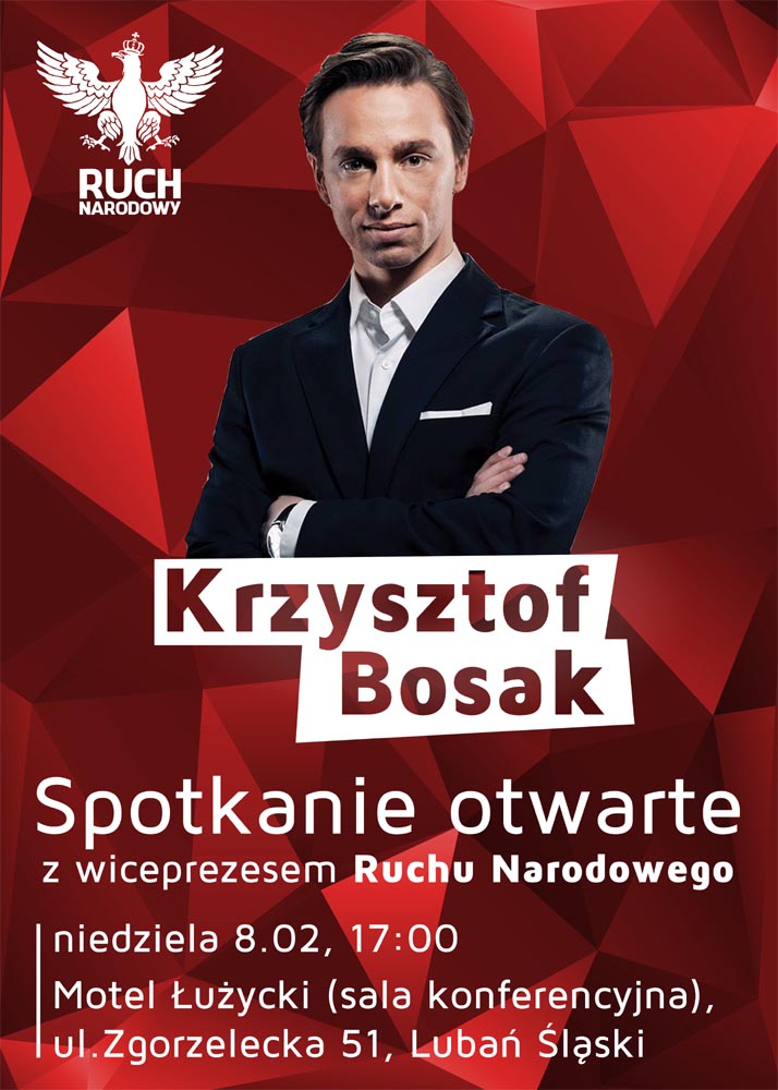 W imieniu Ruchu Narodowego Lubań pragnę zaprosić Państwa na spotkanie otwarte z wiceprezesem RN Krzysztofem Bosakiem, które odbędzie się w dniu 08.02.2015 r. w sali konferencyjnej Motelu Łużyckiego w Lubaniu o godzinie 17:00.