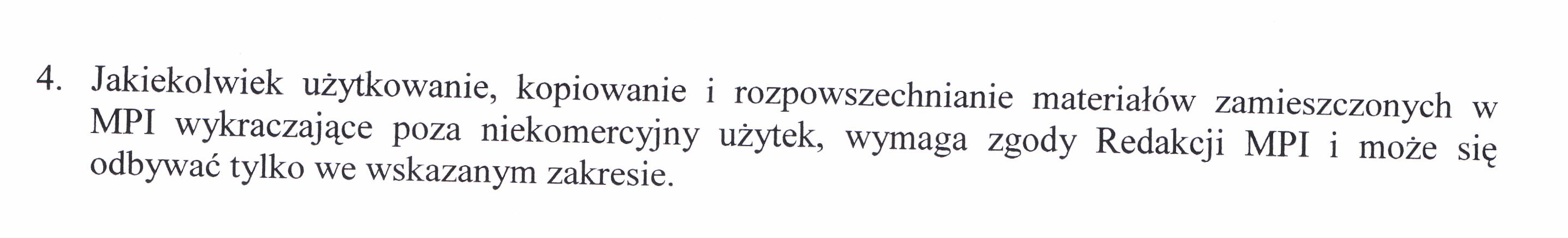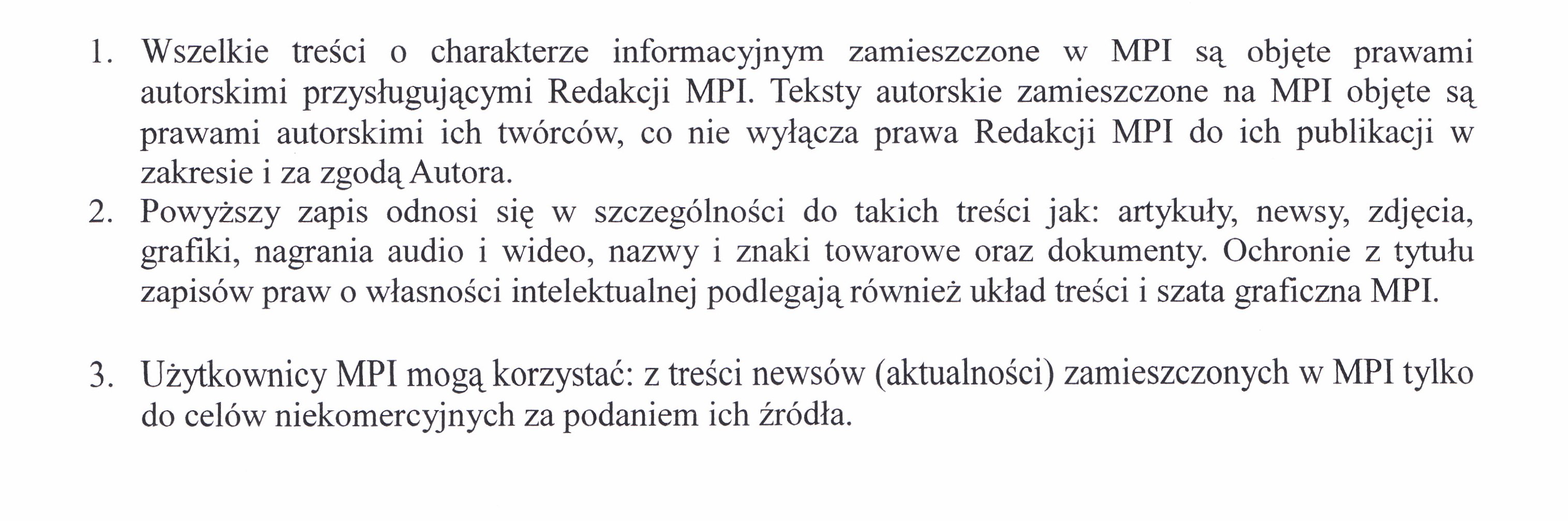 Punkt 4 Rozdziału III Regulaminu pozwala na „skorzystanie z treści aktualności” po uzyskaniu zgody Redakcji MPI.