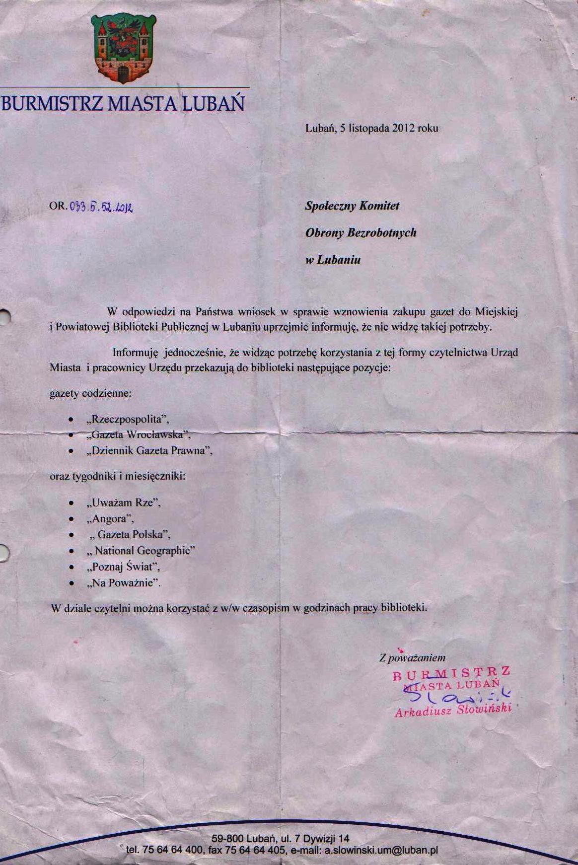 Społeczny Komitet Obrony Bezrobotnych w Lubaniu, którego członkowie regularnie korzystali z czytelni, w proteście przeciwko wstrzymaniu zakupu gazet i czasopism, wystosował do burmistrza Arkadiusza Słowińskiego pisemny wniosek o wznowienie prenumeraty. Jednak burmistrz w odpowiedzi na wniosek SKOB (skan poniżej), z dnia 5 listopada 2012 roku stwierdził, że nie widzi potrzeby wznowienia zakupu gazet do MiPBP, a na ostatniej sesji Rady Miejskiej nawet obraził się na dyrektorkę biblioteki Małgorzatę Piotrowską, za to że szefowa MiPBP w raporcie dla radnych stwierdziła, że miasto nie daje pieniędzy na prenumeratę dzienników i czasopism drukowanych do czytelni.