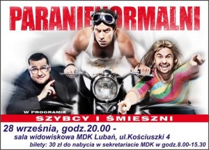 28 września br. w sali widowiskowej Miejskiego Domu Kultury w Lubaniu wystąpi znany kabaret Paranienormalni. Bilety w cenie 30 zł są do nabycia w sekretariacie MDK, od poniedziałku do piątku w godzinach od 08.00 do 15.30. Wystep rozpocznie się o godzinie 20.00.