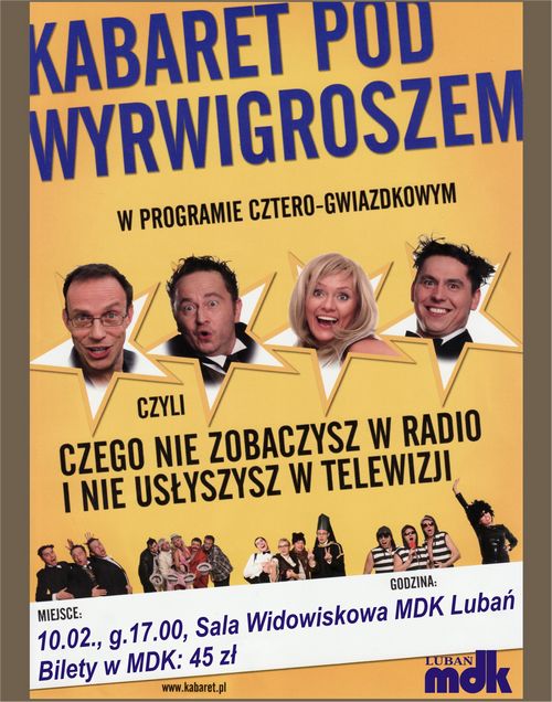 Na scenie sali widowiskowej Miejskiego Domu Kultury w Lubaniu wystąpi Kabaret Pod Wyrwigroszem Beata Rybarska Łukasz Rybarski, Maurycy Polaski, Andrzej Kozłowski, i Tomasz Olbratowski dadzą popis wyszukanej satyry już 10 lutego.