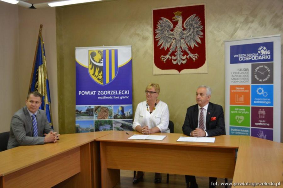 We wtorek w Starostwie Powiatowym w Zgorzelcu podpisano porozumienie o współpracy pomiędzy Wyższą Szkołą Gospodarki w Bydgoszczy a Powiatem Zgorzeleckim, na mocy którego w Zgorzelcu powstanie zamiejscowy wydział taj uczelni. Celem porozumienia jest m.in. wzajemne wsparcie merytoryczne, wsparcie studentów w procesie kształcenia i przygotowanie ich do wejścia na rynek pracy. Obie strony zadeklarowały, że będą wspierały i realizowały statutowe zadania uczelni, a także powiatu. Porozumienie podpisała Starosta Zgorzelecki Urszula Ciupak i Rektor WSG w Bydgoszczy dr inż. Wiesław Olszewski.