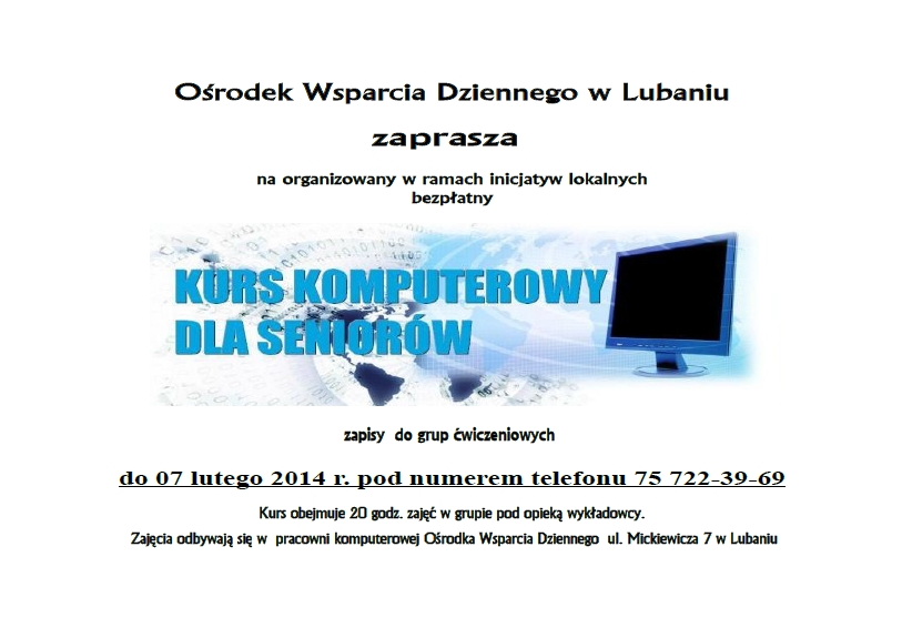Ośrodek Wsparcia Dziennego w Lubaniu zaprasza na organizowany w ramach inicjatyw lokalnych, bezpłatny kurs komputerowy dla seniorów.