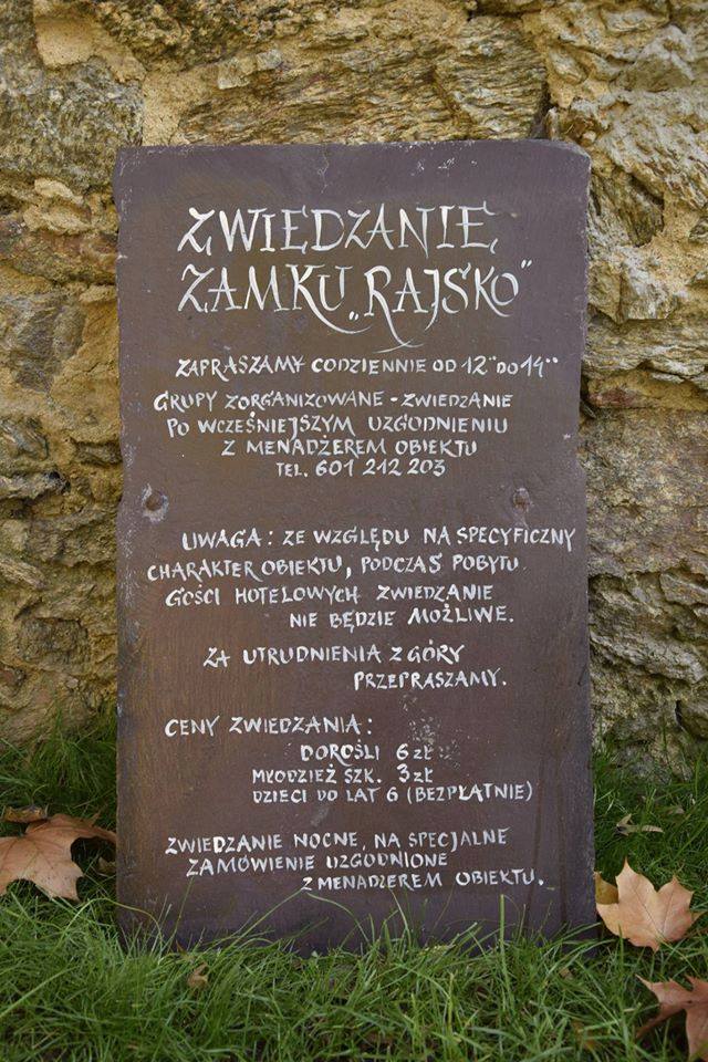 Warownia, która przez minione 70 lat była wyłącznie malowniczą ruiną, dziś staje otworem dla wszystkich, którzy chcą poznać kolejną olszyńską perełkę. Zwiedzanie Zamku Rajsko jest możliwe codziennie od godziny 12.00 do 14.00. Grupy zorganizowane mogą odwiedzić obiekt po wcześniejszym uzgodnieniu z menadżerem pod nr tel. 601-212-203. Ze względu na specyficzny charakter warowni zwiedzanie dotyczy tylko obszaru na zewnątrz po trasie – brama, taras widokowy, wieża, mały taras, sala Rycerska (tylko przez szklane drzwi), brama. Jest też możliwe zwiedzanie nocne – na specjalne zamówienie. Koszt wstępu: dorośli – 6 zł, młodzież szkolna – 3 zł, a dzieci do lat 6 – bezpłatnie. Jedynie podczas pobytu gości hotelowych zwiedzanie nie będzie możliwe, ale sam fakt, że Zamek znowu tętni życiem to już powód do satysfakcji.