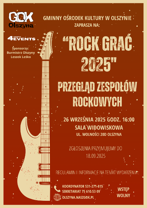 Gminny Ośrodek Kultury w Olszynie zaprasza na Przegląd Zespołów Rockowych pn. Rock Grać, który odbędzie się 26 września br. w sali widowiskowej GOK.