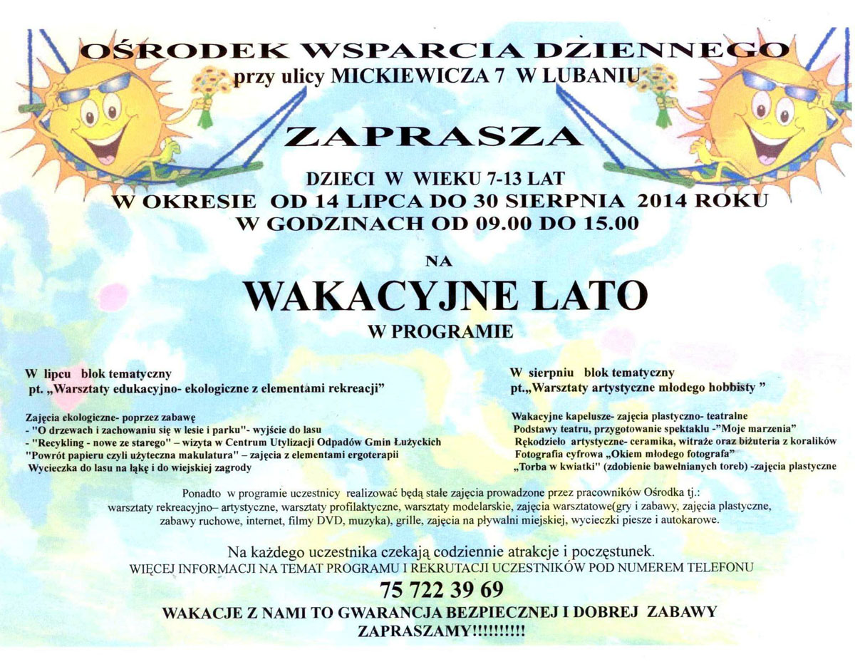 Ośrodek Wsparcia Dziennego prowadzić będzie w okresie od 14.07.2014 do 29.08.2014 od poniedziałku do piątku w godzinach 09:00 do 15:00, w budynku przy ul. Mickiewicza 7 zajęcia dla dzieci w wieku 7-13 lat, z terenu miasta Lubań. Rekrutacja odbywa się od 06.06.2014r., poprzez osobiste zapisy w siedzibie Ośrodka oraz zgłoszenia telefoniczne pod numerem telefonu 75 7223969 od poniedziałku do piątku w godzinach 08:00-16:00.