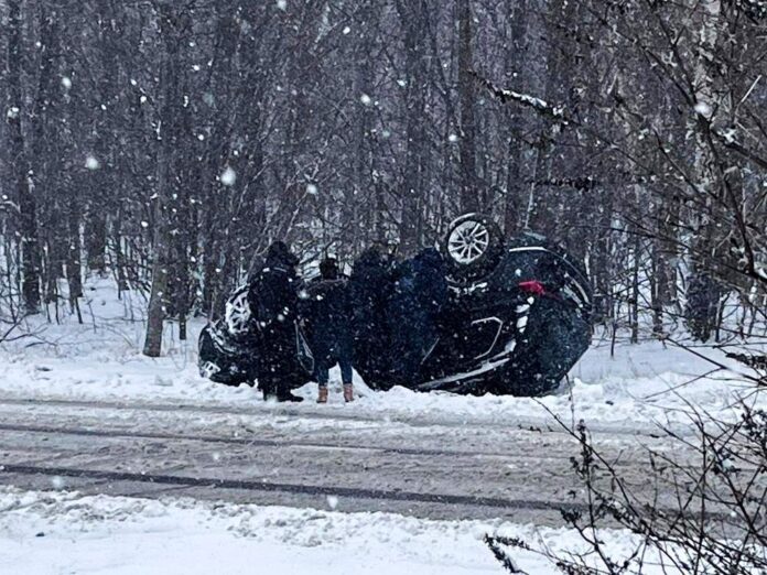 Kierujący SUV-em na śliskiej nawierzchni najprawdopodobniej w wyniku niedostosowania prędkości do warunków panujących na drodze stracił panowanie nad swoim autem, to wypadło z drogi i dachowało.