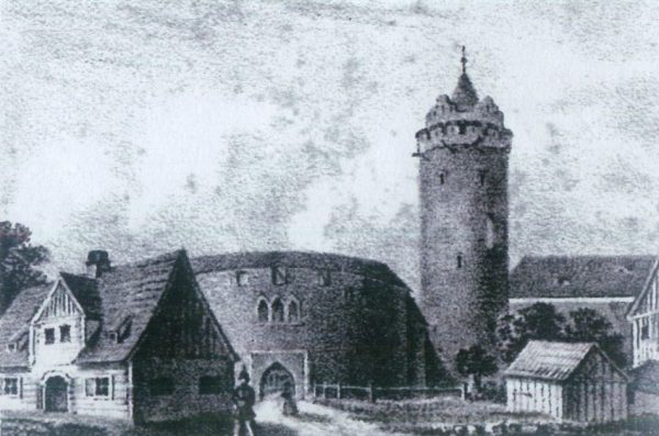 Widok na plac przed barbakanem, na podstawie oryginalnej ryciny z 1805 roku. Po lewej karczma strzelecka.
