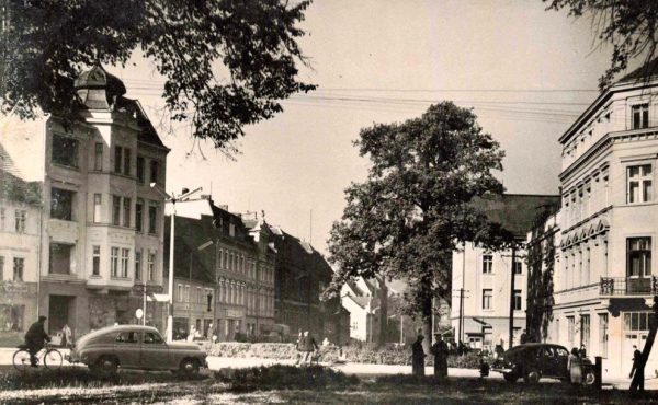 1954 rok. Widoczna na skwerze niewielka piekarenko-cukierenka.