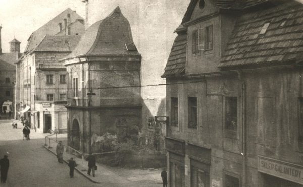 Plac Okrzei w Lubaniu. Po prawej stronie budynek spółdzielczy znajdujący się w miejscu Kościoła Krzyża