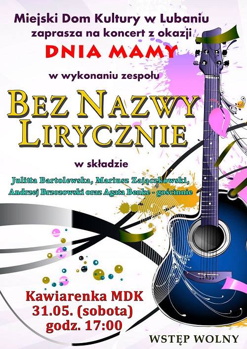 W sobotę 31 maja o godz.17:00 zapraszamy na koncert zespołu Bez Nazwy Lirycznie dedykowany wszystkim mamom. W trakcie koncertu będzie można usłyszeć piosenki z repertuaru m.in. Leonarda Kohena, Starego Dobrego Małżeństwa, Roberta Kasprzyckiego, Małżeństwa z rozsądku i innych. Zespół wystąpi w składzie: Julitta Bartolewska, Mariusz Zajączkowski, Andrzej Brzozowski oraz gościnnie Agata Benke. Wstęp na koncert jest bezpłatny.