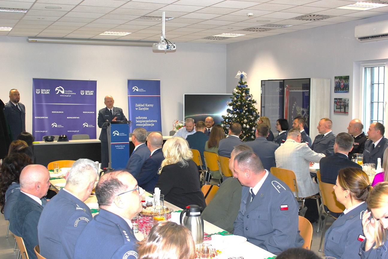 –Oficjalną część wydarzenia zainicjował kpt Paweł Burniak, kierownik Działu Ochrony, który złożył meldunek przybyłemu na spotkanie Dyrektorowi Okręgowemu Służby Więziennej w Opolu, płk. Łukaszowi Górnemu. Następnie zgromadzeni wysłuchali przemówienia dyrektora Zakładu Karnego, mjr Mateusza Jaraczewskiego, który podziękował za przybycie na spotkanie i owocną współpracę oraz wsparcie w realizacji misji jednostki – informuje rzecznik Zakładu Karnego w Zarębie mł. chor. Damian Kościen. – Spotkanie przebiegło w serdecznej atmosferze, sprzyjającej integracji uczestników oraz podtrzymywaniu dobrych relacji między jednostkami administracji, służbami mundurowymi i lokalną społecznością. Tego rodzaju wydarzenia są nie tylko okazją do podsumowania minionego roku, ale także platformą do omawiania planów i wyzwań na przyszłość – dodaje rzecznik.