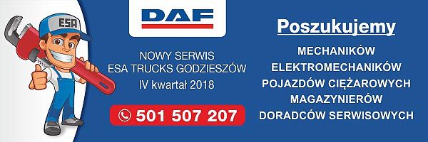Nowy serwis ESA Truck Godzieszów, który zostanie oddany do użytku w IV kwartale br. poszukuje pracowników – mechaników, elektromechaników pojazdów ciężarowych, magazynierów, doradców serwisowych. Oferujemy atrakcyjne warunki zatrudnienia i płacy. Zostań naszym pracownikiem – serdecznie zapraszamy!